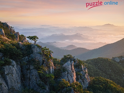 Góry, Skały, Korea Południowa, Drzewa, Park prowincjonalny Daedunsan, Wschód słońca, Prowincja Jeolla Północna
