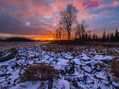 Kamienie, Rosja, Półwysep Kolski, Drzewa, Zachód słońca,  Rzeka Umba, Chmury, Obwód murmański