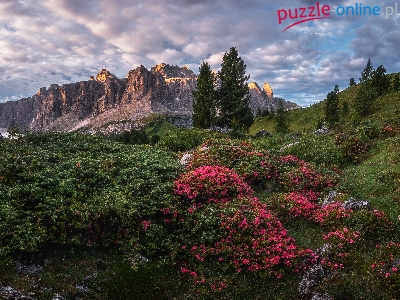 Włochy, Góry, Drzewa, Dolina Van Gardena, Dolomity, Różaneczniki