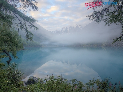 Jezioro Szawlińskie, Drzew, Rosja, Gałązki, Góry, Mgła, Republika Ałtaju