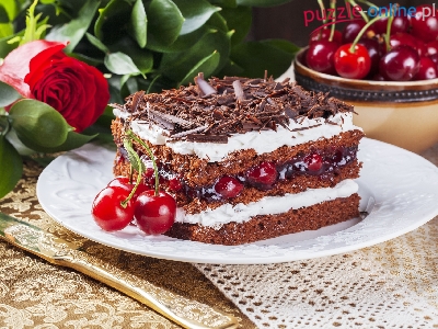 Puzzle Róża, Ciasto, Wiśnie, Talerz