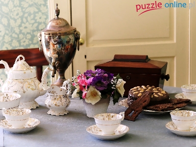 Porcelana, Zastawa, Ciasto, Samowar, Kwiaty, Dzbanek, Stół, Filiżanki, Wazon