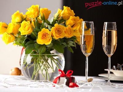 Żółte, Białe, Prezent, Kieliszki, Wazon, Róże, Wino