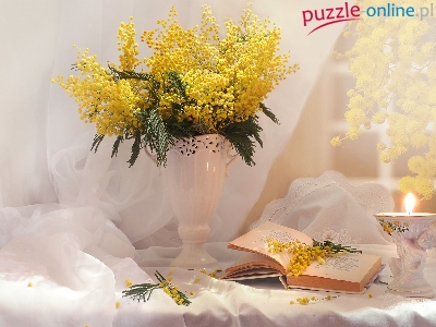 Książka, Akacja srebrzysta, Świecznik, Bukiet, Wazon, Świeczka