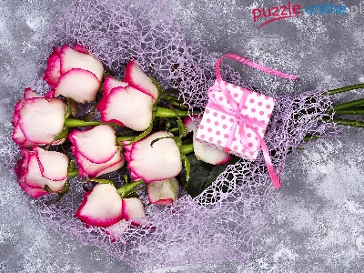 Prezent, Biało-różowe, Tło, Róże, Bukiet, Szare