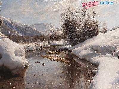 Obraz, Drzewa, Zima, Rzeka, Malarstwo, Peder Mork Monsted, Góry