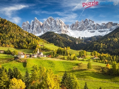 Dolina Val di Funes, Dolomity, Góry, Masyw Odle, Drzewa, Jesień, Włochy, Wieś Santa Maddalena, Lasy