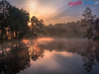 Wschód słońca, Poranek, Odbicie, Serednikowo, Rosja, Drzewa, Staw Barski, Mgła, Obwód moskiewski