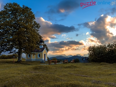 Drzewo, Niemcy, Krun, Chmury, Góry, Kaplica Maria Rast, Ławki, Bawaria