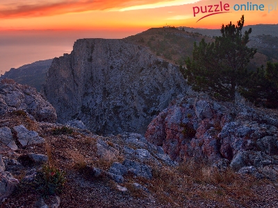 Skały, Drzewa, Skaliste, Góry, Zachód słońca