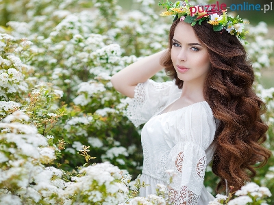 Szatynka, Krzewy, Bluzka, Długowłosa, Biała, Kobieta, Wianek, Okwiecone