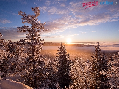 Las, Rosja, Park Narodowy Taganaj, Mgła, Chmury, Zima, Wschód słońca, Obwód czelabiński