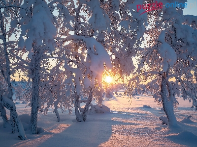 Puzzle Drzewa, Wschód słońca, Ośnieżone, Zima