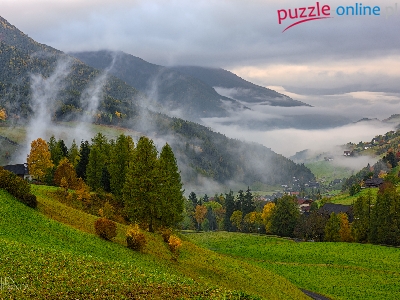 Santa Maddalena, Wieś, Drzewa, Wzgórza, Mgła, Dolomity, Włochy, Góry, Domy