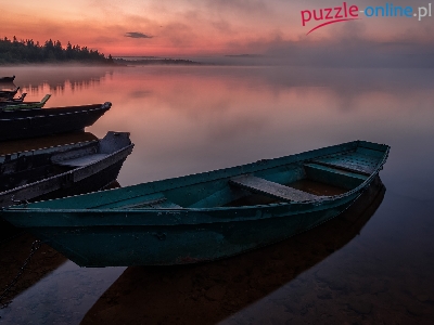 Łódki, Park Narodowy Ziuratkul, Rosja, Zachód słońca, Jezioro Ziuratkul, Mgła, Obwód czelabiński