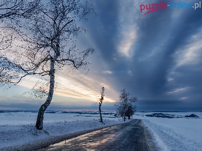 Drzewa, Zachód słońca, Zima, Droga, Chmury