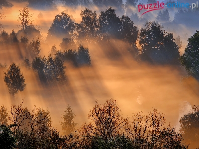 Puzzle Mgła, Drzewa, Las, Przebijające światło