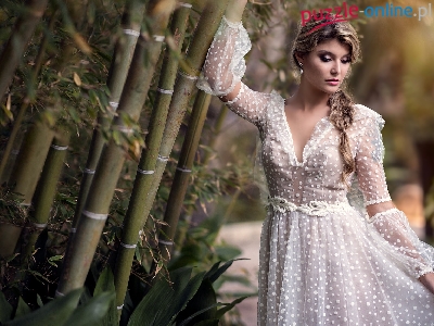 Warkocz, Blondynka, Suknia, Drzewa, Rośliny, Biała, Długowłosa, Kobieta, Bambus