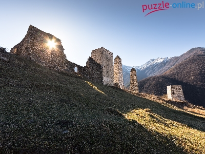 Promienie słońca, Erzi, Rosja, Wieże obronne, Ruiny, Góry, Republika Inguszetii