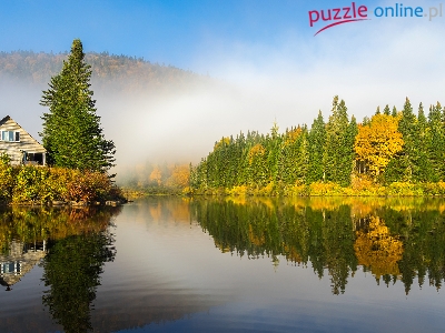 Dom, Świerki, Mgła, Jezioro, Drzewa, Lasy, Odbicie