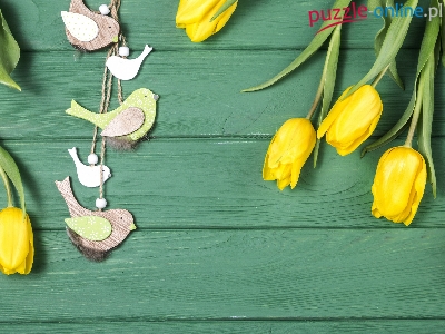 Żółte, Ptaszki, Deski, Zawieszka, Kwiaty, Tulipany, Zielone