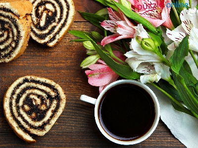 Rolada, Filiżanka, Alstremeria, Kawa, Ciasto, Kwiaty