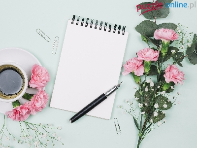 Spinacze, Kawa, Pióro, Filiżanka, Goździki, Notes
