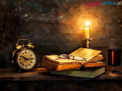 Książki, Świeca, Zegar, Budzik, Okulary