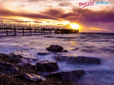 Zachód Słońca, Fale, Molo, Chmury, Skały