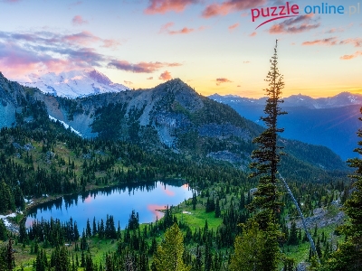 Jezioro Crystal Lake, Stany Zjednoczone, Park Narodowy Mount Rainier, Drzewa, Chmury, Góry, Promienie słońca, Stan Waszyngton