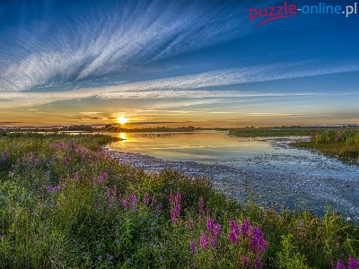 Chmury, Roślinność, Kwiaty, Rzeka, Wschód słońca, Łąka
