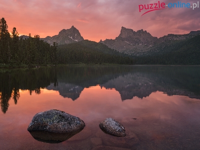 Drzewa, Jezioro, Odbicie, Góry, Zachód Słońca, Kamienie