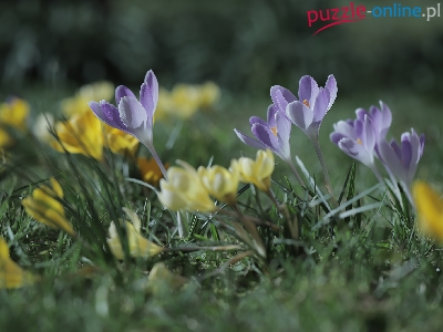 Puzzle Krokusy, Liliowe, Żółte, Kwiaty