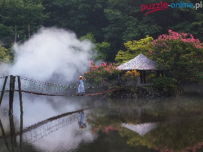 Most wiszący, Drzewa, Człowiek, Dom, Mgła, Rzeka, Kwiaty