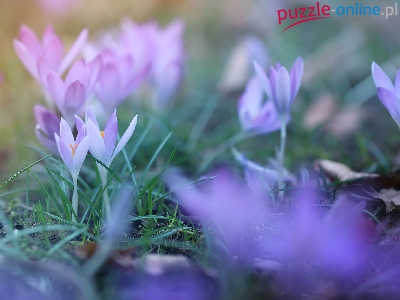 Kwiaty, Zbliżenie, Krokusy, Fioletowe, Trawa