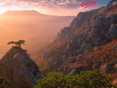 Skały, Dolina, Mgła, Drzewa, Góry, Sosna, Wschód słońca