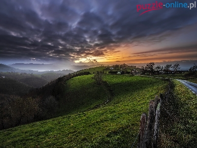 Ogrodzenie, Wieś, Niebo, Wzgórza, Zachmurzone, Droga, Chmury, Domy