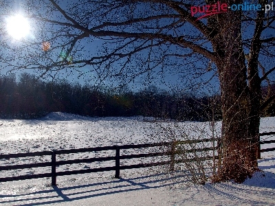 Ogrodzenie, Słońce, Zima, Drzewa, Śnieg