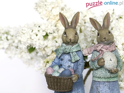 Zajączki, Figurki, Gałązki, Bez, Tło, Pisanki, Wielkanoc, Koszyk, Białe