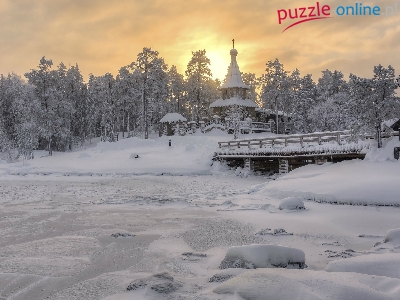 Cerkiew, Rosja, Wyspa Wałaam, Rzeka, Drzewa, Zima, Most, Karelia