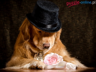 Puzzle Kapelusz, Pies, Golden retriever, Róża