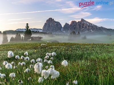Domy, Kwiaty, Dolina Val Gardena, Góry Sassolungo, Włochy, Płaskowyż Seiser Alm, Łąka, Mgła, Dolomity