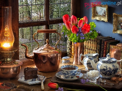 Cukier, Okno, Lampa naftowa, Książki, Zastawa, Ciasto, Herbata, Kompozycja, Tulipany, Obrazy, Czajnik, Kwiaty, Porcelanowa