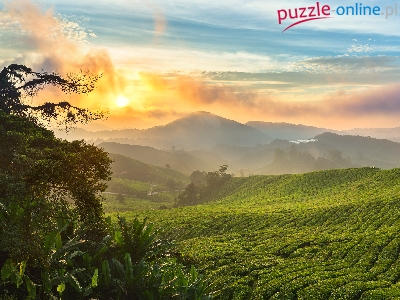 Drzewa, Góry Cameron, Wschód słońca, Cameron Highlands, Malezja, Chmury, Wzgórza, Plantacja, Stan Pahang
