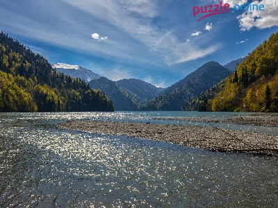 Puzzle Rzeka, Niebo, Las, Góry