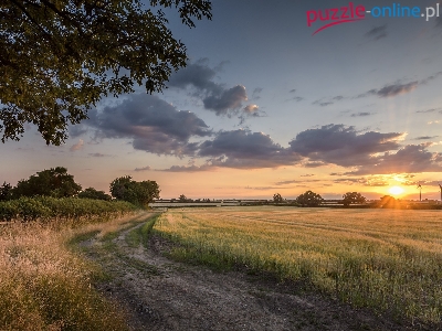 Droga, Gałęzie, Chmury, Drzewa, Wschód słońca, Pola, Trawa