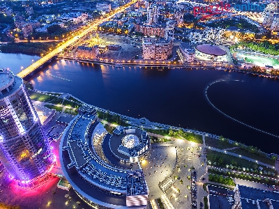 Miasto, Wieczór, Rosja, Rzeka Iset, Jekaterynburg, Z lotu ptaka, Obwód swierdłowski
