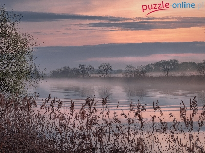 Wschód słońca, Łotwa, Trzciny, Mgła, Drzewa, Poranek, Rzeka Dubna, Łatgalia