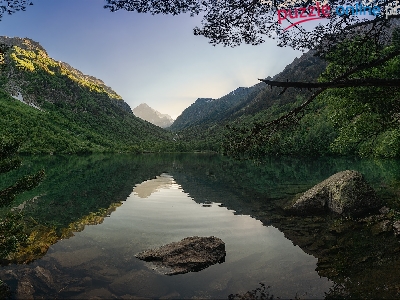 Odbicie, Wzgórza, Kamienie, Góry, Jezioro, Drzewa