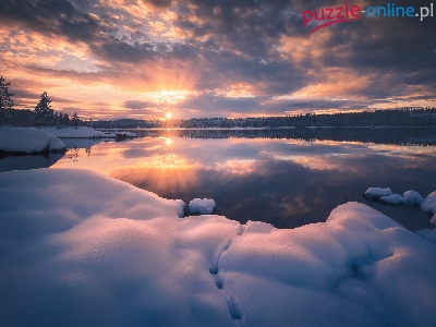 Ringerike, Chmury, Zima, Drzewa, Norwegia, Jezioro, Promienie słońca